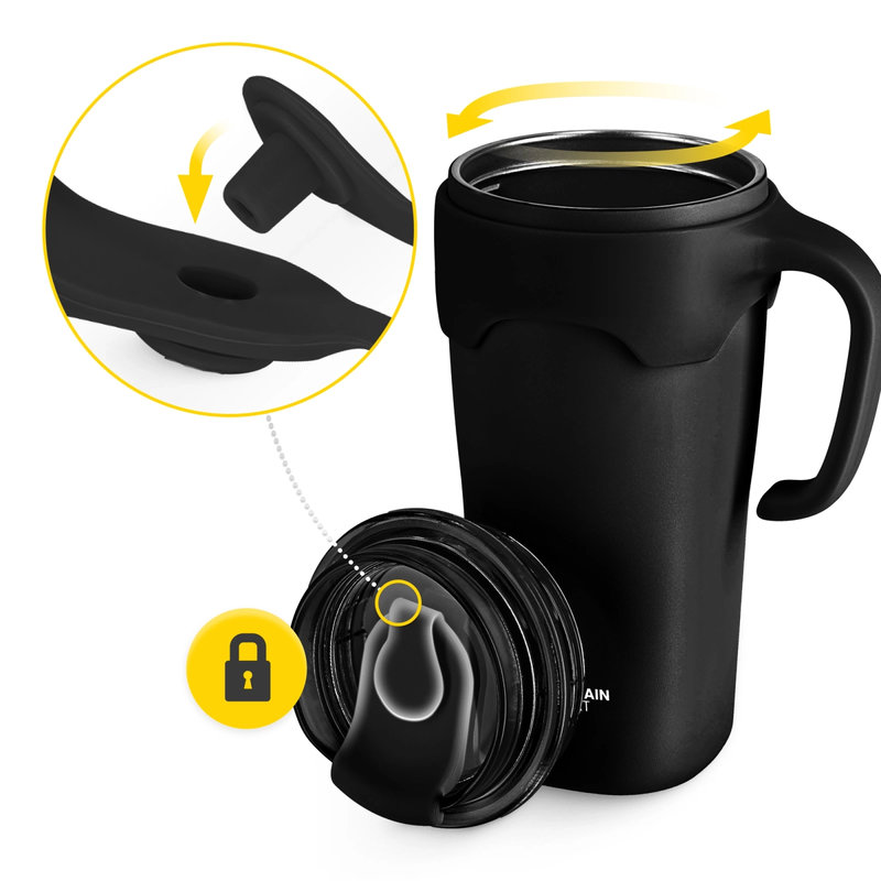 A gdy jesteś w ruchu? Boczny uchwyt sprawia, że kubek pewnie leży w dłoni, nawet przy pojemności 650 ml, a antypoślizgowa podstawa zapobiega jego przesuwaniu się po blacie.