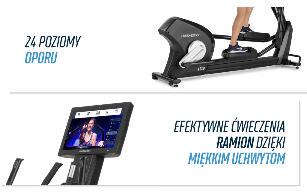 Rower eliptyczny e22.9 marki Freemotion to sprzęt dla użytkowników na każdym poziomie zaawansowania. Pozwala spalać więcej kalorii i szybciej poprawiać kondycję, jednocześnie minimalizując obciążenie stawów. Dzięki integracji z platformą iFIT użytkownicy mogą korzystać z tysięcy interaktywnych treningów prowadzonych przez profesjonalnych trenerów, którzy motywują, dostosowując intensywność ćwiczeń, aby odzwierciedlała trasę, którą pokonujemy. Możliwość eksploracji wirtualnych tras z całego świata i automatyczne dostosowywanie oporu sprawia, że każdy trening staje się inspirującą przygodą, która zachęca do osiągania coraz lepszych wyników.