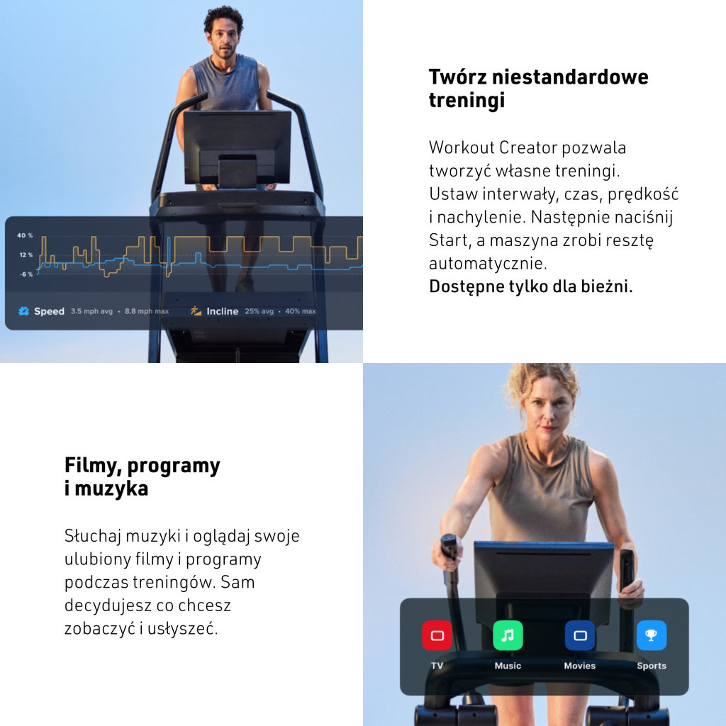 Dodatkowo, funkcja automatycznego dostosowywania parametrów treningu sprawia, że możesz skupić się na rozrywce, podczas gdy iFit dostosowuje prędkość, nachylenie lub opór urządzenia zgodnie z Twoim planem treningowym.